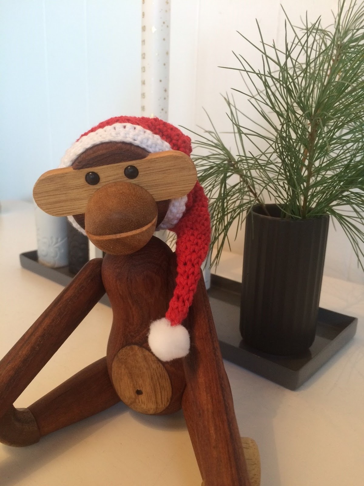 Bl.a har jeg fået hæklet en nissehue til min abe, så nu er også denne klar til jul.